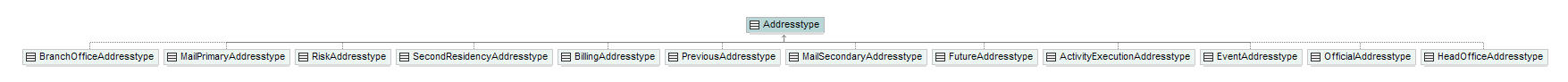 | ownedMember | AbbreviatedNametype ABIPolicyIdentifiertype ABSAvailabilityMannerCodetype AccelerationSpeedMeasuretype AcceptanceDerogationTypeCodetype AcceptingBeneficiaryTypeCodetype AccessoriesReplacementCostAmounttype AccessoriesTransferCostAmounttype Accessoriestype AccidentalDeceaseCovertype AccidentCauseTexttype AccidentGravityLevelCodetype AccidentNotificationJointlySignedIndicatortype AccidentOccurredInBelgiumIndicatortype AccidentPersonIdentifiertype AccidentPreventionProceedingTexttype AccidentPreventionProceedingTypeCodetype AccidentRegisterBIdentifiertype AccidentsInsuranceTypeCodetype AccidentsSinceAdjustmentCounttype AccidentsSinceAdjustmenttype AccidentTreatmentPhaseCodetype AccidentTypeCodetype AccountingDatetype AccountingDocumentCurrencyCodetype AccountingDocumentLineContractIdentifiertype AccountingDocumentLinetype AccountingDocumenttype AcquisitionCommissionTotalAmounttype AcquisitionCommissiontype ActionDateAndTimetype ActionDescriptionTexttype ActionEffectiveDatetype Actiontype ActivityExecutionAddresstype ActivityExecutionLocationTexttype Activitytype ActivityTypeTexttype ActualIndextype ActualInsurerOftype ActualValuetype AdaptationAndAidCovertype AdditionalActivitytype AdditionalInsuredValueAmounttype AdditionalOccupationtype AdditionalSeatsCounttype AdditionalSubmissionAdresseeIdentificationCodetype AdditionalSubmissionOrRelatedDocumenttype AdditionalSubmissionSendingCodetype AdditionalSubmissionTotalCounttype AdditionsValueTotalAmounttype AddOnInsurertype AddressExtensiontype AddressIdentifiertype AddressLanguageCodetype Addresstype AdministrationCostAmounttype AdministrativeChangeOnlyIndicatortype AdministrativeRefusalIndicatortype ADRNumbertype AdvanceAmounttype AdvantageInKindReceptionDeclarationtype AdvantageInKindtype AdvantageInKindTypeCodetype AffinityGroupIdentifiertype AffinityGroupTypeCodetype AgeLimitExcessIndicatortype AgeOfVehicleBasedDiscountPercentagetype AggravatedTheftRiskVehicleIndicatortype AgreedSubrogationIndicatortype AirVehicletype AlarmAcknowledgementTypeCodetype AllDriversOverReferenceAgeIndicatortype AmbulatoryMedicalExpensesCovertype AmendmentDatetype AmendmentEffectiveDatetype AmendmentIdentifiertype AmendmentReasonCodetype AmendmentReasonTexttype AmendmentSubIdentifiertype Amendmenttype AmendmentTypeCodetype AmountArithmeticSignCodetype AmountLevelCodetype AmountPaidAdditionAmounttype AmountPaidDeductionAmounttype AmountPaidTypeCodetype AnimalAcquisitionDatetype AnimalGenderCodetype AnimalNameTexttype AnimalRegistrationIdentifiertype AnimalsCounttype Animaltype AnimalTypeCodetype AnnualIndemnificationtype AnnualPremiumIndexedtype AnnualPremiumNonIndexedtype AnnualPremiumtype AnnulmentDatetype AnnulmentReasonCodetype Annulmenttype AntennaPresenceIndicatortype AnticipationBonusPercentagetype AnticipationBonusTypeCodetype ApartmentsCounttype ApartmentsIndicatortype AssaultCovertype AssessmentCategoryCodetype AssessmentClosingDatetype AssessmentDatetype AssessmentExpensesGuaranteetype AssessmentFeeQuotationTypeCodetype AssessmentFeeTransferIndicatortype AssessmentFinalizedIndicatortype AssessmentFirstValueAmounttype AssessmentIdentifiertype AssessmentLocationCodetype AssessmentLocationTexttype AssessmentRelatedDocumentSenderTypeCodetype AssessmentRelatedDocumentsToBeDeliveredCodetype AssessmentReportContentsCodetype AssessmentReportCurrencyCodetype AssessmentReportReceptionDatetype AssessmentRequestLastUpdateDatetype AssessmentRequestOriginCodetype AssessmentRequestSentDatetype AssessmentResultTypeCodetype AssessmentRisedByCodetype AssessmentSecondValueAmounttype Assessmenttype AssessmentTypeCodetype AssessorAcknowledgementIdentifiertype AssessorAppointedIndicatortype AssessorAppointmentTypeCodetype AssessorFirstInterventionDatetype AssessorRegionCodetype Assessortype AssessorTypeCodetype AssignedAssessmentTypeCodetype AttacksAndTerrorismGuaranteetype AttacksAndWorkConflictsGuaranteetype AudatexAssemblySchemeIdentifiertype AudatexBlocTexttype AudatexCalculationIndicatortype AudatexCalculationsCounttype AutomaticForfeitizationIndicatortype AVCValueInclusiveCatalogueValueIndicatortype AverageConsumptionQuantitytype AverageMileagePerYearCounttype AviationLicenceLossCovertype BackLeftTyreProfileMeasuretype BackRightTyreProfileMeasuretype BadShapeIndicatortype BalanceOverdueAmounttype BankruptcyDatetype BasePremiumtype BcssKszEntryDatetype BedroomsCounttype Beneficiarytype BeneficiaryTypeCodetype Bicycletype BidAmounttype BidDisqualifiedIndicatortype BidOrOfferCommunicationTexttype BidOrOffertype BidPeriodStartDatetype BidRequestExpiredIndicatortype BidRequestIdentifiertype BidRequestNotificationDatetype BidRequestValidityEndDatetype BidRequestWithdrawnIndicatortype BillingAddresstype BirthDatetype BirthPlaceCodetype BirthPlaceTexttype BodilyInjuryValueAmounttype BondOrStocktype BonusReceptionDeclarationtype BonusSalaryAmounttype Bonustype BonusTypeCodetype BonusWagesPaymentFrequencyCodetype booleantype BordereauLinePremiumInvoiceIdentifiertype BordereauLineRenewalMainDatetype BordereauLinetype BordereauTotalLinetype Bordereautype BoxNumberIdentifiertype BranchOfficeAddresstype BranchSenioritytype BRBOperationCodetype BreedTexttype BrokerAccountIdentifiertype BrokerAdministrationCostAmounttype BrokerAdministrationCostPercentagetype BrokerClaimIdentifiertype BrokerIsActiveIndicatortype BrokerIsPartnerIndicatortype BrokerPolicyIdentifiertype BrokerProcurationApplicationIndicatortype BuildingAdoptedCapitalAmounttype BuildingConstructionMaterialTypeCodetype BuildingHolderCategoryCodetype BuildingHolderRunsBusinessIndicatortype BuildingHoldertype Buildingtype BuildingUnderConstructionIndicatortype BureauxCounttype BurglaryDamagesGuaranteetype BurglaryMannerCodetype BurglaryOrThefttype BurnsGuaranteetype Calculationtype CancellationDatetype CancellationNoticeDeliveryIndicatortype CancellationNotifiedToPreviousInsurerIndicatortype CancellationOriginCodetype CancellationReasonCodetype CancellationStatusCodetype Cancellationtype Capitaltype CapitalT
