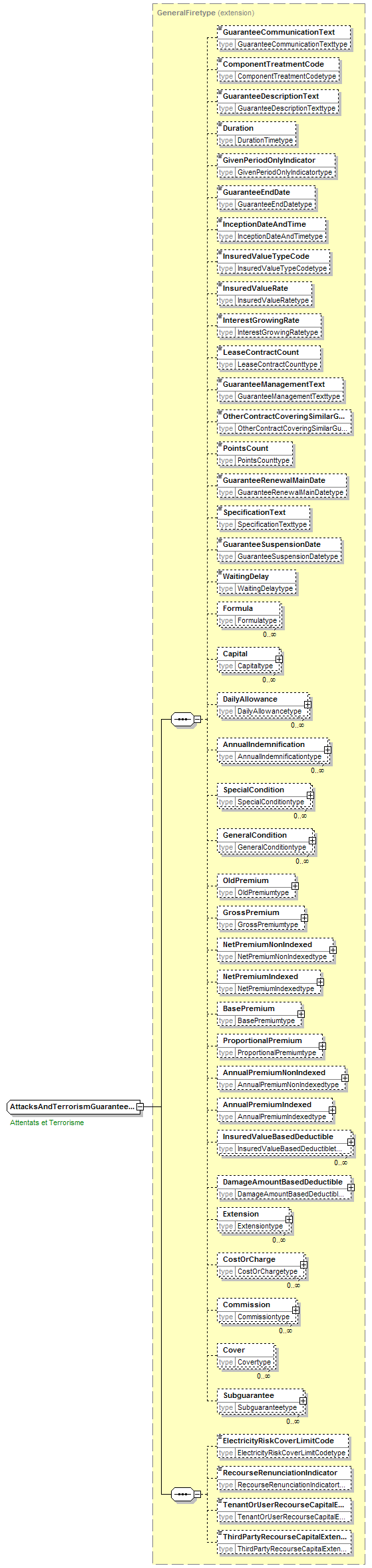 | children | GuaranteeCommunicationText ComponentTreatmentCode GuaranteeDescriptionText Duration GivenPeriodOnlyIndicator GuaranteeEndDate InceptionDateAndTime InsuredValueTypeCode InsuredValueRate InterestGrowingRate LeaseContractCount GuaranteeManagementText OtherContractCoveringSimilarGuaranteeIndicator PointsCount GuaranteeRenewalMainDate SpecificationText GuaranteeSuspensionDate WaitingDelay Formula Capital DailyAllowance AnnualIndemnification SpecialCondition GeneralCondition OldPremium GrossPremium NetPremiumNonIndexed NetPremiumIndexed BasePremium ProportionalPremium AnnualPremiumNonIndexed AnnualPremiumIndexed InsuredValueBasedDeductible DamageAmountBasedDeductible Extension CostOrCharge Commission Cover Subguarantee ElectricityRiskCoverLimitCode RecourseRenunciationIndicator TenantOrUserRecourseCapitalExtensionAmount ThirdPartyRecourseCapitalExtensionAmount | ||||||||||||||