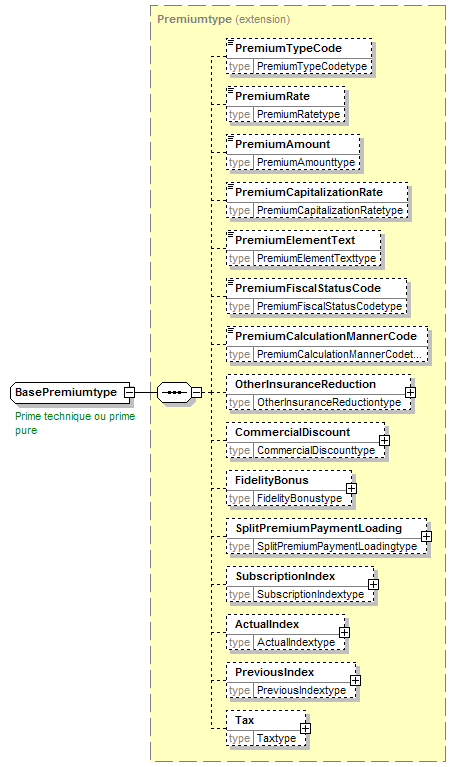 | source | <xsd:complexType name="BasePremiumtype"> <xsd:annotation> <xsd:appinfo source="tb2Semantics">The amount used as the basis for a premium calculation for a policy or a specific guarantee. Synonym is TariffPremium.</xsd:appinfo> <xsd:appinfo source="tb2Edifact">(MOA+061)</xsd:appinfo> <xsd:documentation source="BusinessTerm" xml:lang="fr">Prime technique ou prime pure</xsd:documentation> <xsd:documentation source="BusinessTerm" xml:lang="nl">Technische premie of zuivere premie</xsd:documentation> <xsd:documentation source="BusinessTerm" xml:lang="ge">Basisprämie</xsd:documentation> <xsd:documentation source="BusinessTerm" xml:lang="en">Base or technical premium</xsd:documentation> <xsd:documentation source="BusinessDefinition" xml:lang="fr">Pour une garantie tarifée, la somme des montants "Prime de Risque" et "Charges Techniques". Prime nécessaire à l’assureur pour couvrir techniquement le risque. La prime pure fait partie de la prime nette. Voir schéma "Composition des primes".</xsd:documentation> <xsd:documentation source="BusinessDefinition" xml:lang="nl">Voor een getarifeerde waarborg, de som van de bedragen "Risicopremie" en "Technische Lasten". Premie die de verzekeraar nodig heeft om het risico technisch te dekken. De zuivere premie maakt deel uit de netto premie. Zie schema "Samenstelling van premies"</xsd:documentation> <xsd:documentation source="BusinessDefinition" xml:lang="en">Monetary amount - The amount used as the basis for a premium calculation for a policy or a specific guarantee. Synonym is TariffPremium.</xsd:documentation> </xsd:annotation> <xsd:complexContent> <xsd:extension base="Premiumtype"/> </xsd:complexContent> </xsd:complexType> |