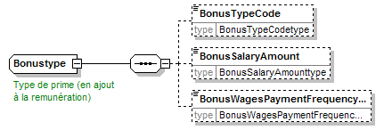 | source | <xsd:complexType name="Bonustype"> <xsd:annotation> <xsd:appinfo source="tb2Semantics">An incentive or an additional payment to employees.</xsd:appinfo> <xsd:appinfo source="tb2Edifact">(RDT+CQA4)</xsd:appinfo> <xsd:documentation source="BusinessTerm" xml:lang="fr">Type de prime (en ajout à la remunération)</xsd:documentation> <xsd:documentation source="BusinessTerm" xml:lang="nl">Soort premie (toegevoegd aan verloning)</xsd:documentation> <xsd:documentation source="BusinessTerm" xml:lang="ge">Typ of bonus (an das Lohn zuzufügen)</xsd:documentation> <xsd:documentation source="BusinessTerm" xml:lang="en">Type of bonus (in addition to the wages)</xsd:documentation> <xsd:documentation source="BusinessDefinition" xml:lang="fr">Contient une réponse détail et sa valaur.</xsd:documentation> <xsd:documentation source="BusinessDefinition" xml:lang="nl">Bevat een detailantwoord en zijn waarde.</xsd:documentation> <xsd:documentation source="BusinessDefinition" xml:lang="en">Response details - An incentive or an additional payment to employees.</xsd:documentation> </xsd:annotation> <xsd:complexContent> <xsd:extension base="Responsetype"> <xsd:sequence> <xsd:element name="BonusTypeCode" type="BonusTypeCodetype" minOccurs="0"/> <xsd:element name="BonusSalaryAmount" type="BonusSalaryAmounttype" minOccurs="0"/> <xsd:element name="BonusWagesPaymentFrequencyCode" type="BonusWagesPaymentFrequencyCodetype" minOccurs="0"/> </xsd:sequence> </xsd:extension> </xsd:complexContent> </xsd:complexType> |