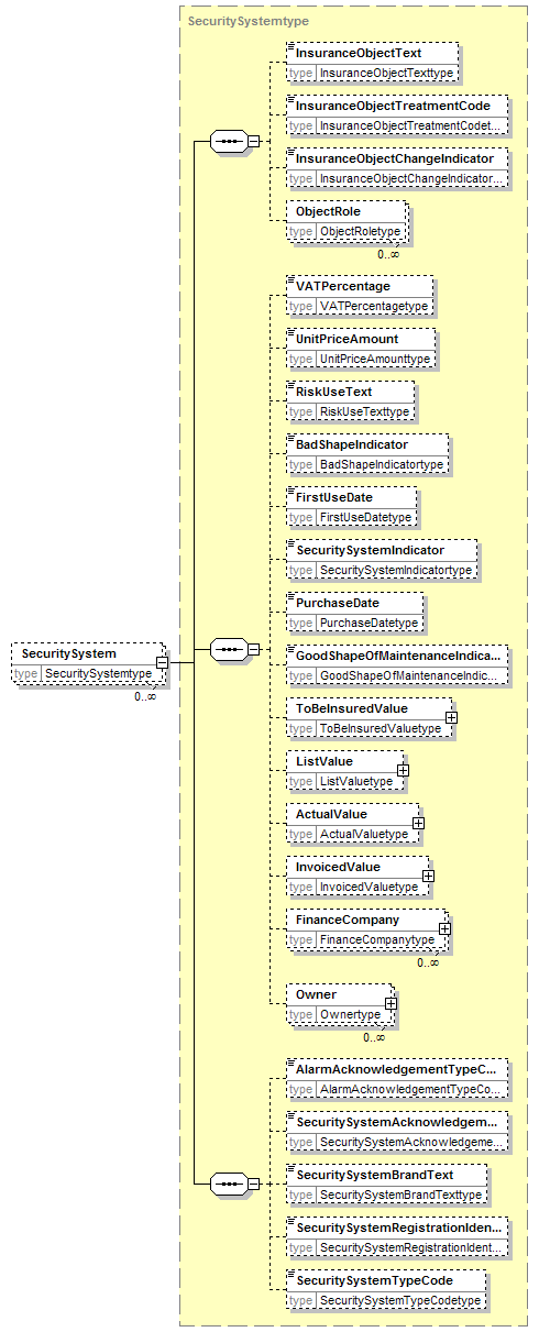 | children | InsuranceObjectText InsuranceObjectTreatmentCode InsuranceObjectChangeIndicator ObjectRole VATPercentage UnitPriceAmount RiskUseText BadShapeIndicator FirstUseDate SecuritySystemIndicator PurchaseDate GoodShapeOfMaintenanceIndicator ToBeInsuredValue ListValue ActualValue InvoicedValue FinanceCompany Owner AlarmAcknowledgementTypeCode SecuritySystemAcknowledgementBodyIdentificationCode SecuritySystemBrandText SecuritySystemRegistrationIdentifier SecuritySystemTypeCode | ||||||||
