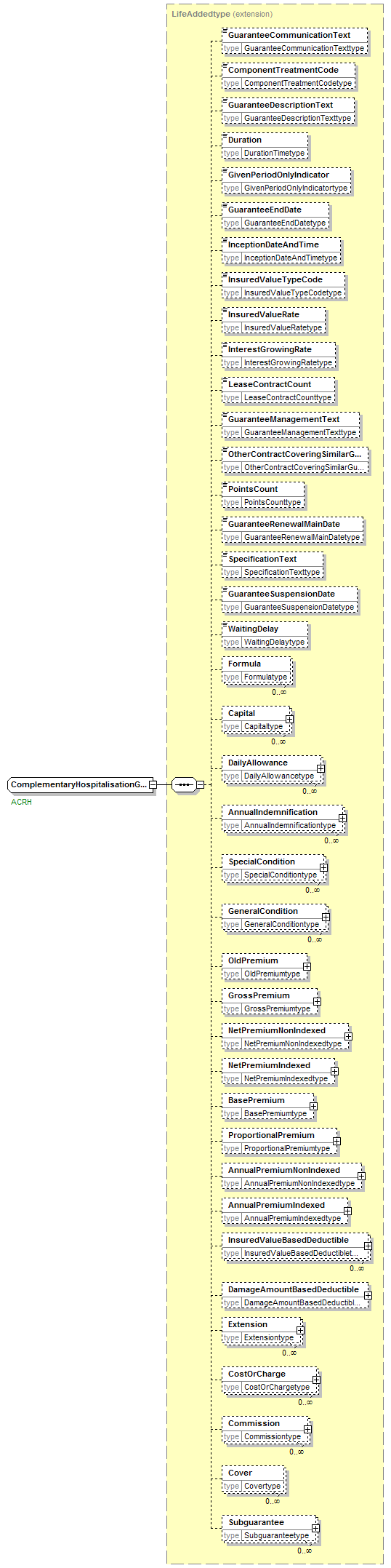 | source | <xsd:complexType name="ComplementaryHospitalisationGuaranteetype"> <xsd:annotation> <xsd:appinfo source="tb2Semantics">ACRH : Assurance Complémentaire contre le Risque d'Hospitalisation. AVRH : Aanvullende Verzekering Risico op Hospitalisatie. Guarantee against some risk of hospitalisation. Allways sold as a complement of some life insurance guarantee.</xsd:appinfo> <xsd:appinfo source="tb2Edifact">Guarantee (ICD+133)</xsd:appinfo> <xsd:documentation source="BusinessTerm" xml:lang="fr">ACRH</xsd:documentation> <xsd:documentation source="BusinessTerm" xml:lang="nl">AVRH</xsd:documentation> <xsd:documentation source="BusinessTerm" xml:lang="ge">Hospitalisationszusatzversicherung</xsd:documentation> <xsd:documentation source="BusinessTerm" xml:lang="en">AIRH</xsd:documentation> <xsd:documentation source="BusinessDefinition" xml:lang="fr">Assurance complémentaire risques hospitalisation qui prévoit, de façon stipulée par le contrat, une indemnisation des frais occasionnés par un séjour à l’hôpital.</xsd:documentation> <xsd:documentation source="BusinessDefinition" xml:lang="nl">Aanvullende verzekering risico’s hospitalisatie die voorziet, al naargelang het contract in mindere of meerdere mate, in een vergoeding van de kosten ontstaan ten gevolge van genoten diensten in een ziekenhuis.</xsd:documentation> <xsd:documentation source="BusinessDefinition" xml:lang="en">Guarantee Add-on Insurance of the Risk of Hospitalisation.</xsd:documentation> </xsd:annotation> <xsd:complexContent> <xsd:extension base="LifeAddedtype"/> </xsd:complexContent> </xsd:complexType> |