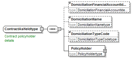 | source | <xsd:complexType name="ContractAsHeldtype"> <xsd:annotation> <xsd:appinfo source="tb2Semantics">A contract is held by a policyholder. (19.06.2007 : transformation from relationshiptype into entitytype)</xsd:appinfo> <xsd:documentation source="BusinessTerm" xml:lang="en">Contract policyholder details</xsd:documentation> <xsd:documentation source="BusinessTerm" xml:lang="nl">Verzekeringsnemer - details</xsd:documentation> <xsd:documentation source="BusinessTerm" xml:lang="fr">Preneur d'assurance, détails</xsd:documentation> </xsd:annotation> <xsd:sequence> <xsd:element name="DomiciliationFinancialAccountIdentifier" type="DomiciliationFinancialAccountIdentifiertype" minOccurs="0"/> <xsd:element name="DomiciliationName" type="DomiciliationNametype" minOccurs="0"/> <xsd:element name="DomiciliationTypeCode" type="DomiciliationTypeCodetype" minOccurs="0"/> <xsd:element name="PolicyHolder" type="PolicyHoldertype"/> </xsd:sequence> </xsd:complexType> |