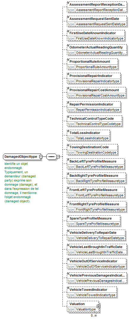 AssessmentReportReceptionDate AssessmentRequestSentDate FirstUseDateKnownIndicator OdometerActualReadingQuantity ProportionalRuleAmount ProvisionalRepairIndicator ProvisionalRepairCostAmount RepairPermissionIndicator TechnicalControlTypeCode TotalLossIndicator TowingDestinationCode BackLeftTyreProfileMeasure BackRightTyreProfileMeasure FrontLeftTyreProfileMeasure FrontRightTyreProfileMeasure SpareTyreProfileMeasure VehicleDeliveryToRepairDate VehicleLastBroughtInTrafficDate VehicleOutOfServiceIndicator VehiclePreviousDamagesIndicator VehicleTowedIndicator Valuation |