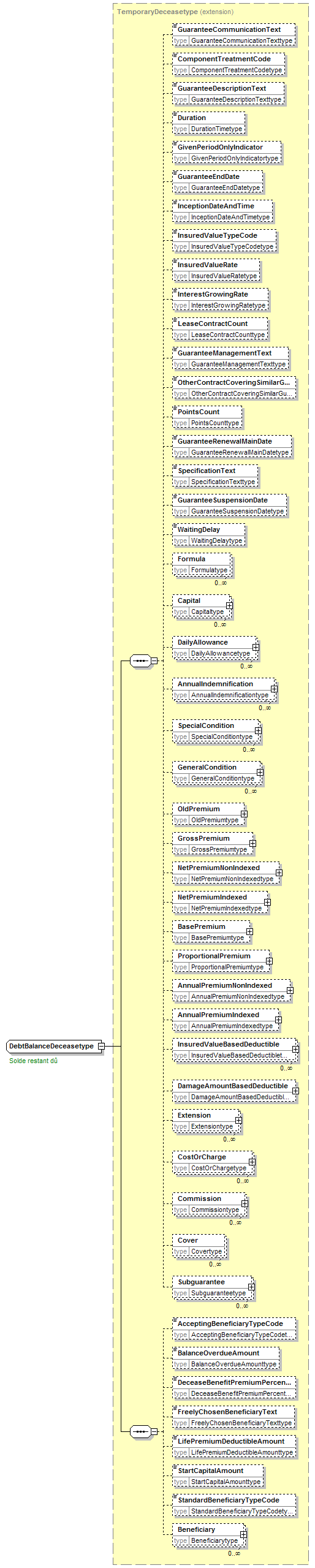 | children | GuaranteeCommunicationText ComponentTreatmentCode GuaranteeDescriptionText Duration GivenPeriodOnlyIndicator GuaranteeEndDate InceptionDateAndTime InsuredValueTypeCode InsuredValueRate InterestGrowingRate LeaseContractCount GuaranteeManagementText OtherContractCoveringSimilarGuaranteeIndicator PointsCount GuaranteeRenewalMainDate SpecificationText GuaranteeSuspensionDate WaitingDelay Formula Capital DailyAllowance AnnualIndemnification SpecialCondition GeneralCondition OldPremium GrossPremium NetPremiumNonIndexed NetPremiumIndexed BasePremium ProportionalPremium AnnualPremiumNonIndexed AnnualPremiumIndexed InsuredValueBasedDeductible DamageAmountBasedDeductible Extension CostOrCharge Commission Cover Subguarantee AcceptingBeneficiaryTypeCode BalanceOverdueAmount DeceaseBenefitPremiumPercentage FreelyChosenBeneficiaryText LifePremiumDeductibleAmount StartCapitalAmount StandardBeneficiaryTypeCode Beneficiary | ||||||||||||||||