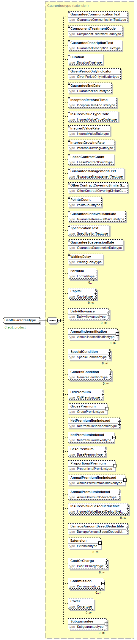 | children | GuaranteeCommunicationText ComponentTreatmentCode GuaranteeDescriptionText Duration GivenPeriodOnlyIndicator GuaranteeEndDate InceptionDateAndTime InsuredValueTypeCode InsuredValueRate InterestGrowingRate LeaseContractCount GuaranteeManagementText OtherContractCoveringSimilarGuaranteeIndicator PointsCount GuaranteeRenewalMainDate SpecificationText GuaranteeSuspensionDate WaitingDelay Formula Capital DailyAllowance AnnualIndemnification SpecialCondition GeneralCondition OldPremium GrossPremium NetPremiumNonIndexed NetPremiumIndexed BasePremium ProportionalPremium AnnualPremiumNonIndexed AnnualPremiumIndexed InsuredValueBasedDeductible DamageAmountBasedDeductible Extension CostOrCharge Commission Cover Subguarantee | ||||||||||||||||