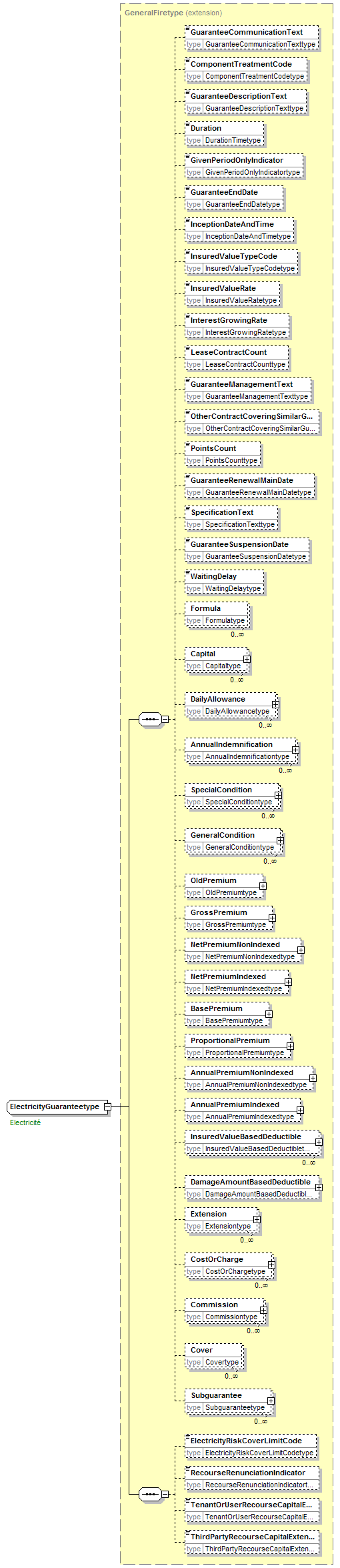 | children | GuaranteeCommunicationText ComponentTreatmentCode GuaranteeDescriptionText Duration GivenPeriodOnlyIndicator GuaranteeEndDate InceptionDateAndTime InsuredValueTypeCode InsuredValueRate InterestGrowingRate LeaseContractCount GuaranteeManagementText OtherContractCoveringSimilarGuaranteeIndicator PointsCount GuaranteeRenewalMainDate SpecificationText GuaranteeSuspensionDate WaitingDelay Formula Capital DailyAllowance AnnualIndemnification SpecialCondition GeneralCondition OldPremium GrossPremium NetPremiumNonIndexed NetPremiumIndexed BasePremium ProportionalPremium AnnualPremiumNonIndexed AnnualPremiumIndexed InsuredValueBasedDeductible DamageAmountBasedDeductible Extension CostOrCharge Commission Cover Subguarantee ElectricityRiskCoverLimitCode RecourseRenunciationIndicator TenantOrUserRecourseCapitalExtensionAmount ThirdPartyRecourseCapitalExtensionAmount | ||||||||||||||