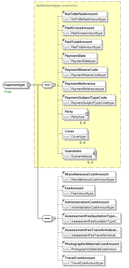 | children | NotToBePaidAmount PaidGrossAmount PaidTotalAmount PaymentDate PaymentMeansCode PaymentReference PaymentSubjectTypeCode Party Cover Guarantee MiscellaneousCostAmount FeeAmount AdministrationCostAmount AssessmentFeeQuotationTypeCode AssessmentFeeTransferIndicator PhotographicMaterialCostAmount TravelCostAmount | ||||||||||||||||||