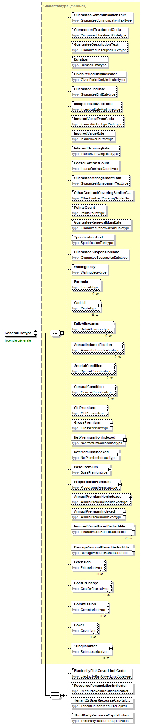 | children | GuaranteeCommunicationText ComponentTreatmentCode GuaranteeDescriptionText Duration GivenPeriodOnlyIndicator GuaranteeEndDate InceptionDateAndTime InsuredValueTypeCode InsuredValueRate InterestGrowingRate LeaseContractCount GuaranteeManagementText OtherContractCoveringSimilarGuaranteeIndicator PointsCount GuaranteeRenewalMainDate SpecificationText GuaranteeSuspensionDate WaitingDelay Formula Capital DailyAllowance AnnualIndemnification SpecialCondition GeneralCondition OldPremium GrossPremium NetPremiumNonIndexed NetPremiumIndexed BasePremium ProportionalPremium AnnualPremiumNonIndexed AnnualPremiumIndexed InsuredValueBasedDeductible DamageAmountBasedDeductible Extension CostOrCharge Commission Cover Subguarantee ElectricityRiskCoverLimitCode RecourseRenunciationIndicator TenantOrUserRecourseCapitalExtensionAmount ThirdPartyRecourseCapitalExtensionAmount | ||||||||||||||||||