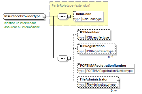 | source | <xsd:complexType name="InsuranceProvidertype"> <xsd:annotation> <xsd:appinfo source="tb2Semantics">A party registered and controlled by the national Insurance Control Board (OCA/CDV).</xsd:appinfo> <xsd:appinfo source="tb2Edifact">(PTY)</xsd:appinfo> <xsd:documentation source="BusinessDefinition" xml:lang="fr">Identifie un intervenant, assureur ou intermédiaire..</xsd:documentation> <xsd:documentation source="BusinessDefinition" xml:lang="nl">Identificeert een betrokkene, verzekeraar of tussenpersoon.</xsd:documentation> <xsd:documentation source="BusinessDefinition" xml:lang="en">Party, insurer or broker.</xsd:documentation> <xsd:documentation source="BusinessTerm" xml:lang="en">Insurance provider</xsd:documentation> <xsd:documentation source="BusinessTerm" xml:lang="nl">Leverancier verzekering</xsd:documentation> <xsd:documentation source="BusinessTerm" xml:lang="fr">Fournisseur de l'assurance</xsd:documentation> </xsd:annotation> <xsd:complexContent> <xsd:extension base="PartyRoletype"> <xsd:sequence> <xsd:element name="ICBIdentifier" type="ICBIdentifiertype" minOccurs="0"/> <xsd:element name="ICBRegistration" type="ICBRegistrationtype" minOccurs="0" maxOccurs="3"/> <xsd:element name="PORTIMARegistrationNumber" type="PORTIMARegistrationNumbertype" minOccurs="0"/> <xsd:element name="FileAdministrator" type="FileAdministratortype" minOccurs="0" maxOccurs="unbounded"/> </xsd:sequence> </xsd:extension> </xsd:complexContent> </xsd:complexType> |
