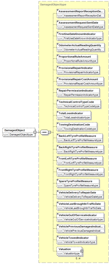 | children | AssessmentReportReceptionDate AssessmentRequestSentDate FirstUseDateKnownIndicator OdometerActualReadingQuantity ProportionalRuleAmount ProvisionalRepairIndicator ProvisionalRepairCostAmount RepairPermissionIndicator TechnicalControlTypeCode TotalLossIndicator TowingDestinationCode BackLeftTyreProfileMeasure BackRightTyreProfileMeasure FrontLeftTyreProfileMeasure FrontRightTyreProfileMeasure SpareTyreProfileMeasure VehicleDeliveryToRepairDate VehicleLastBroughtInTrafficDate VehicleOutOfServiceIndicator VehiclePreviousDamagesIndicator VehicleTowedIndicator Valuation | ||||||||