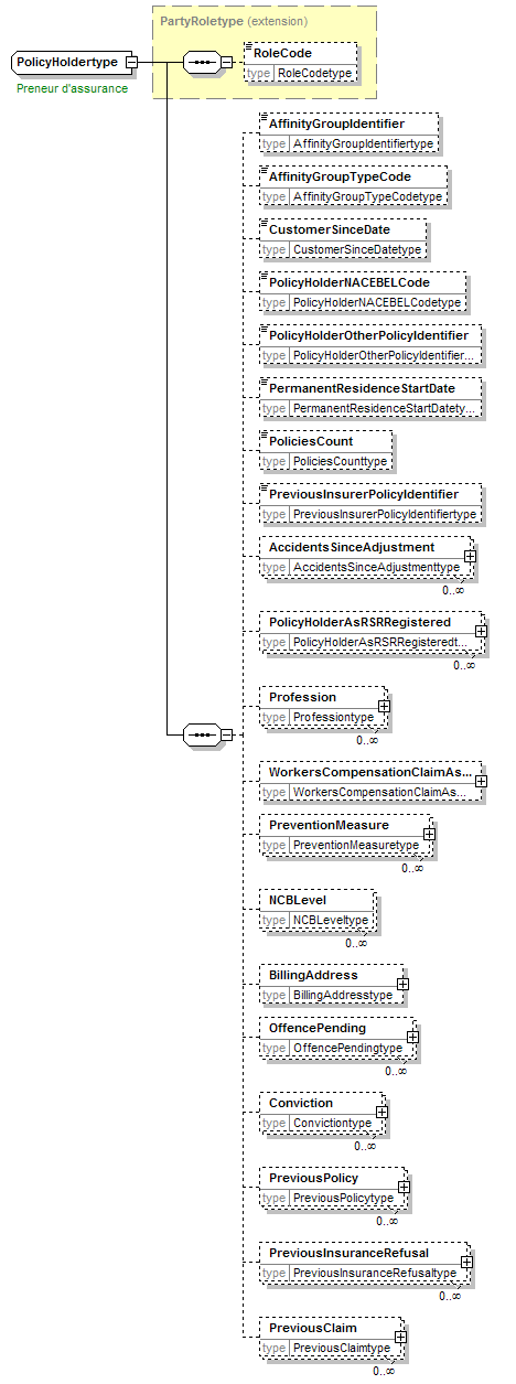 RoleCode AffinityGroupIdentifier AffinityGroupTypeCode CustomerSinceDate PolicyHolderNACEBELCode PolicyHolderOtherPolicyIdentifier PermanentResidenceStartDate PoliciesCount PreviousInsurerPolicyIdentifier AccidentsSinceAdjustment PolicyHolderAsRSRRegistered Profession WorkersCompensationClaimAsPolicyHeld PreventionMeasure NCBLevel BillingAddress OffencePending Conviction PreviousPolicy PreviousInsuranceRefusal PreviousClaim |