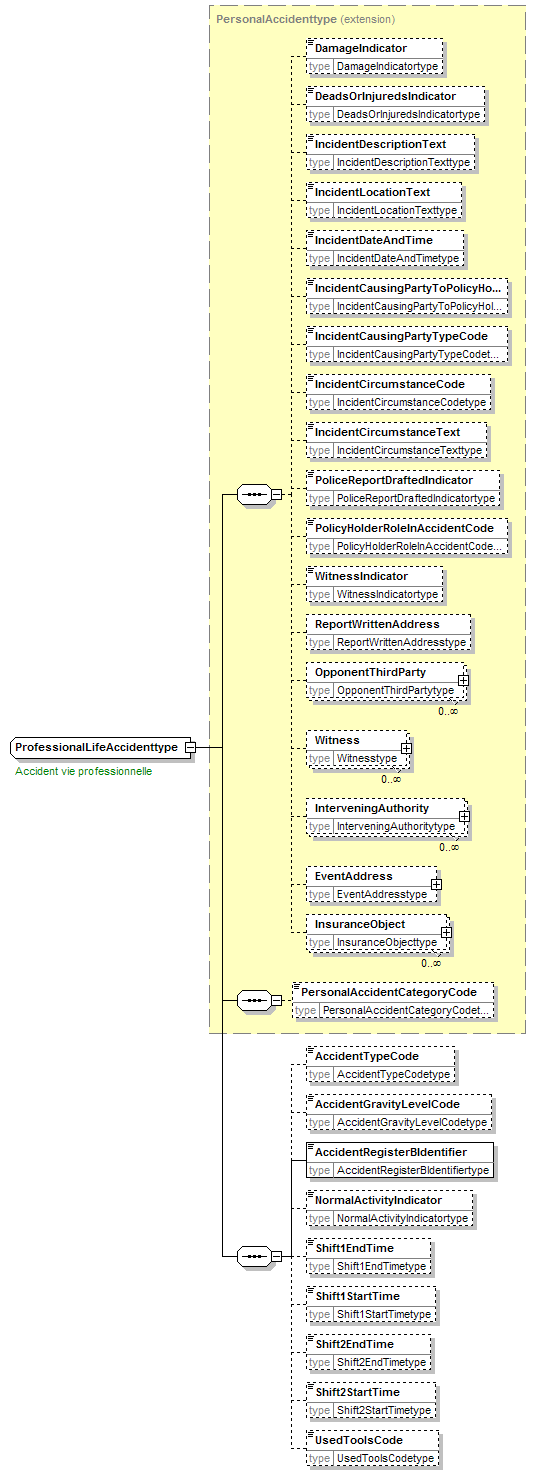| source | <xsd:complexType name="ProfessionalLifeAccidenttype"> <xsd:annotation> <xsd:appinfo source="tb2Semantics">An event or occurrence which is unforeseen and unintended.</xsd:appinfo> <xsd:appinfo source="tb2Edifact">(EVT+201)</xsd:appinfo> <xsd:documentation source="BusinessTerm" xml:lang="fr">Accident vie professionnelle</xsd:documentation> <xsd:documentation source="BusinessTerm" xml:lang="nl">Ongeval beroepsleven</xsd:documentation> <xsd:documentation source="BusinessTerm" xml:lang="ge">Berufsunfall</xsd:documentation> <xsd:documentation source="BusinessTerm" xml:lang="en">Professional accident</xsd:documentation> <xsd:documentation source="BusinessDefinition" xml:lang="fr">Identifie un événement.<br/>Typiquement des événements dans un contexte sinistres</xsd:documentation> <xsd:documentation source="BusinessDefinition" xml:lang="nl">Identificeert een gebeurtenis.<br/>Men denkt hier in eerste instantie in het kader van de schades.</xsd:documentation> <xsd:documentation source="BusinessDefinition" xml:lang="en">Event</xsd:documentation> </xsd:annotation> <xsd:complexContent> <xsd:extension base="PersonalAccidenttype"> <xsd:sequence> <xsd:element name="AccidentTypeCode" type="AccidentTypeCodetype" minOccurs="0"/> <xsd:element name="AccidentGravityLevelCode" type="AccidentGravityLevelCodetype" minOccurs="0"/> <xsd:element name="AccidentRegisterBIdentifier" type="AccidentRegisterBIdentifiertype"/> <xsd:element name="NormalActivityIndicator" type="NormalActivityIndicatortype" minOccurs="0"/> <xsd:element name="Shift1EndTime" type="Shift1EndTimetype" minOccurs="0"/> <xsd:element name="Shift1StartTime" type="Shift1StartTimetype" minOccurs="0"/> <xsd:element name="Shift2EndTime" type="Shift2EndTimetype" minOccurs="0"/> <xsd:element name="Shift2StartTime" type="Shift2StartTimetype" minOccurs="0"/> <xsd:element name="UsedToolsCode" type="UsedToolsCodetype" minOccurs="0"/> </xsd:sequence> </xsd:extension> </xsd:complexContent> </xsd:complexType> |