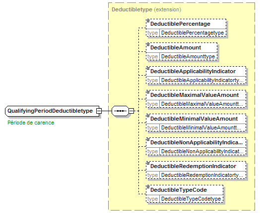 | source | <xsd:complexType name="QualifyingPeriodDeductibletype"> <xsd:annotation> <xsd:appinfo source="tb2Semantics">A qualifying period as some deductible.</xsd:appinfo> <xsd:appinfo source="tb2Edifact">(DED+010)</xsd:appinfo> <xsd:documentation source="BusinessTerm" xml:lang="fr">Période de carence</xsd:documentation> <xsd:documentation source="BusinessTerm" xml:lang="nl">Wachttijd</xsd:documentation> <xsd:documentation source="BusinessTerm" xml:lang="ge">Wartezeit</xsd:documentation> <xsd:documentation source="BusinessTerm" xml:lang="en">Qualifying period</xsd:documentation> <xsd:documentation source="BusinessDefinition" xml:lang="fr">L'assureur ne peut être tenu à prester que dés qu'il y a dépassement du délai de carence. La notion "franchise seuil" indiquera si ou ou non il y aura prestations sur ce délai même.</xsd:documentation> <xsd:documentation source="BusinessDefinition" xml:lang="nl">De verzekeraar is gehouden tot zijn prestaties van zodra de wachttijd overschreden wordt. De notie "drempelvrijstelling" zal aantonen of er al dan niet prestaties zijn voor de verlopen wachttijd zelf.</xsd:documentation> <xsd:documentation source="BusinessDefinition" xml:lang="en">Qualifying period precedes timespan where there is actual coverage.</xsd:documentation> </xsd:annotation> <xsd:complexContent> <xsd:extension base="Deductibletype"/> </xsd:complexContent> </xsd:complexType> |