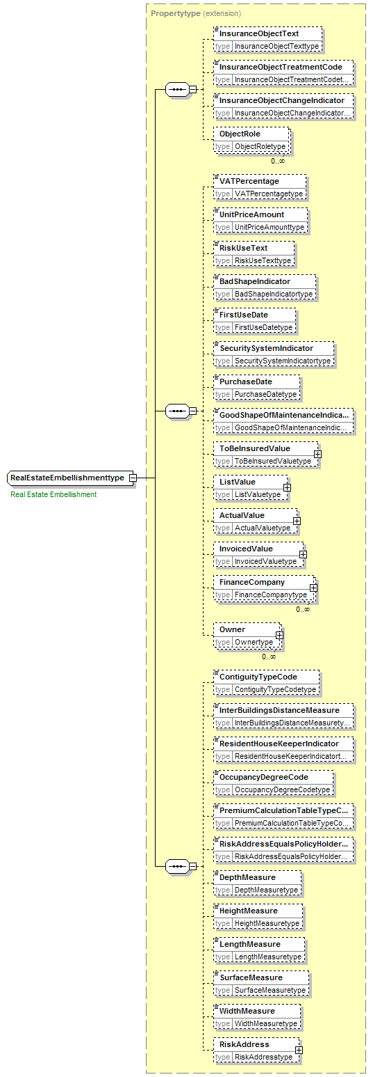 | children | InsuranceObjectText InsuranceObjectTreatmentCode InsuranceObjectChangeIndicator ObjectRole VATPercentage UnitPriceAmount RiskUseText BadShapeIndicator FirstUseDate SecuritySystemIndicator PurchaseDate GoodShapeOfMaintenanceIndicator ToBeInsuredValue ListValue ActualValue InvoicedValue FinanceCompany Owner ContiguityTypeCode InterBuildingsDistanceMeasure ResidentHouseKeeperIndicator OccupancyDegreeCode PremiumCalculationTableTypeCode RiskAddressEqualsPolicyHolderAddressIndicator DepthMeasure HeightMeasure LengthMeasure SurfaceMeasure WidthMeasure RiskAddress | ||||||||||||||||