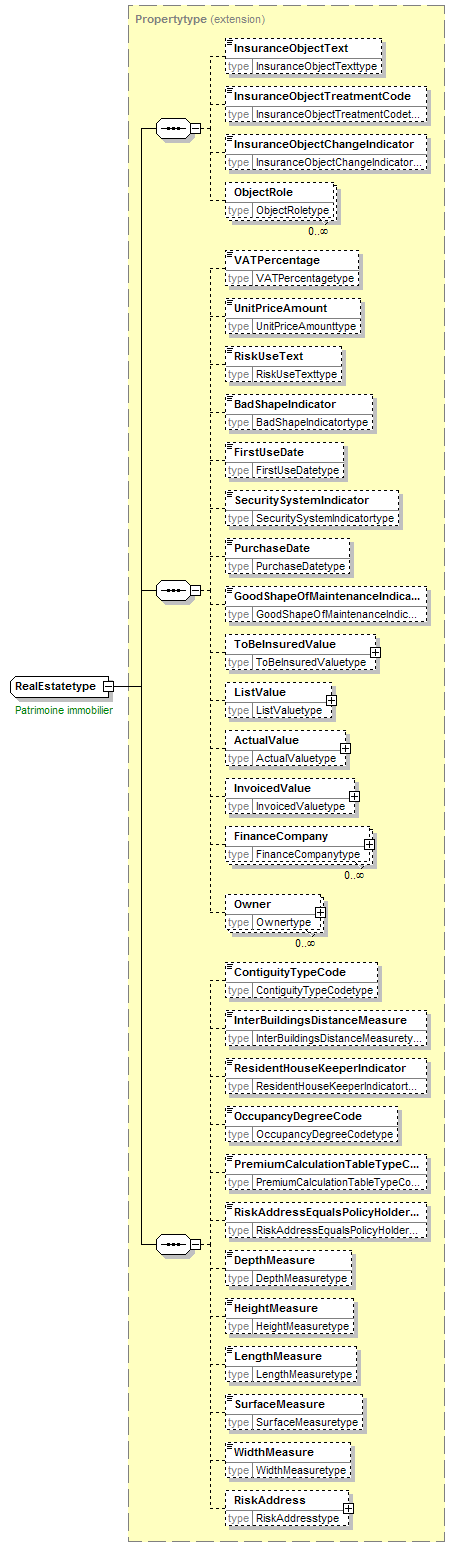 | source | <xsd:complexType name="RealEstatetype"> <xsd:annotation> <xsd:appinfo source="tb2Semantics">Property in houses and land.</xsd:appinfo> <xsd:appinfo source="tb2Edifact">(ROD+013)</xsd:appinfo> <xsd:documentation source="BusinessTerm" xml:lang="fr">Patrimoine immobilier</xsd:documentation> <xsd:documentation source="BusinessTerm" xml:lang="nl">Onroerend patrimonium</xsd:documentation> <xsd:documentation source="BusinessTerm" xml:lang="ge">Immobiliarvermögen</xsd:documentation> <xsd:documentation source="BusinessTerm" xml:lang="en">Property, estate</xsd:documentation> <xsd:documentation source="BusinessDefinition" xml:lang="fr">Ensemble de bâtiments et ou terrains non bâtis.</xsd:documentation> <xsd:documentation source="BusinessDefinition" xml:lang="nl">Geheel van gebouwen en niet bebouwde gronden.</xsd:documentation> <xsd:documentation source="BusinessDefinition" xml:lang="en">Risk Object</xsd:documentation> </xsd:annotation> <xsd:complexContent> <xsd:extension base="Propertytype"/> </xsd:complexContent> </xsd:complexType> |