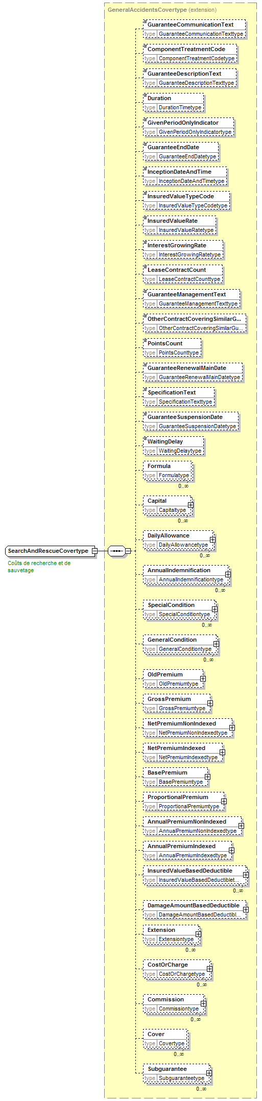 | source | <xsd:complexType name="SearchAndRescueCovertype"> <xsd:annotation> <xsd:appinfo source="tb2Edifact">(ICD+270)</xsd:appinfo> <xsd:documentation source="BusinessTerm" xml:lang="fr">Coûts de recherche et de sauvetage</xsd:documentation> <xsd:documentation source="BusinessTerm" xml:lang="nl">Opzoekings- en Reddingskosten</xsd:documentation> <xsd:documentation source="BusinessTerm" xml:lang="ge">Such un Rettungskosten</xsd:documentation> <xsd:documentation source="BusinessTerm" xml:lang="en">Search and rescue costs</xsd:documentation> <xsd:documentation source="BusinessDefinition" xml:lang="fr">Garantie couvrant les frais liés à des procédures de recherche et de sauvetage, par exemple recherche en mer d'un plaisancier suite à une tempête ou recherche en montagne d'un randonneur égaré (frais d'hélicoptère) e.a. Cette garantie fait souvent partie d'une garantie "assistance".</xsd:documentation> <xsd:documentation source="BusinessDefinition" xml:lang="nl">Waarborg die voorziet in de vergoeding van de kosten verbonden aan de verschillende maatregelen genomen ter opsporing en redding in het kader van bijv. een schipbreuk, een ongeval tijdens een bergwandeling (kosten voor een helikopter), e.a. Deze waarborg is vaak een bijhorigheid van de waarborg bijstand.</xsd:documentation> <xsd:documentation source="BusinessDefinition" xml:lang="en">Guarantee - Covering expenses as a result of a search and rescue operation.</xsd:documentation> </xsd:annotation> <xsd:complexContent> <xsd:extension base="GeneralAccidentsCovertype"/> </xsd:complexContent> </xsd:complexType> |