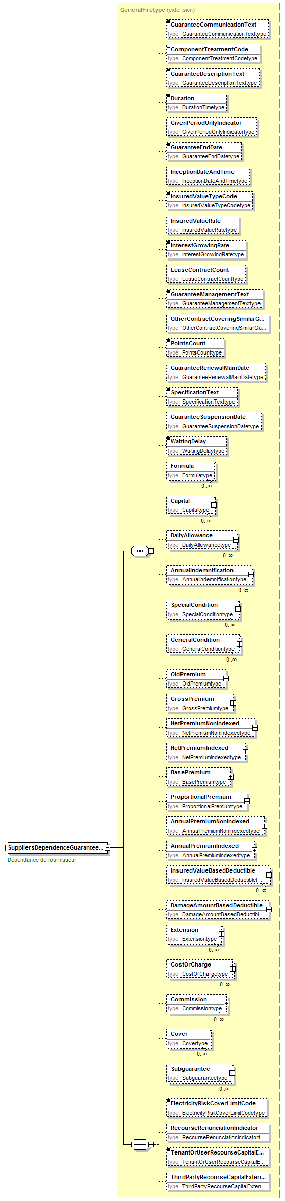 | children | GuaranteeCommunicationText ComponentTreatmentCode GuaranteeDescriptionText Duration GivenPeriodOnlyIndicator GuaranteeEndDate InceptionDateAndTime InsuredValueTypeCode InsuredValueRate InterestGrowingRate LeaseContractCount GuaranteeManagementText OtherContractCoveringSimilarGuaranteeIndicator PointsCount GuaranteeRenewalMainDate SpecificationText GuaranteeSuspensionDate WaitingDelay Formula Capital DailyAllowance AnnualIndemnification SpecialCondition GeneralCondition OldPremium GrossPremium NetPremiumNonIndexed NetPremiumIndexed BasePremium ProportionalPremium AnnualPremiumNonIndexed AnnualPremiumIndexed InsuredValueBasedDeductible DamageAmountBasedDeductible Extension CostOrCharge Commission Cover Subguarantee ElectricityRiskCoverLimitCode RecourseRenunciationIndicator TenantOrUserRecourseCapitalExtensionAmount ThirdPartyRecourseCapitalExtensionAmount | ||||||||||||||