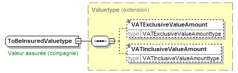 | source | <xsd:complexType name="ToBeInsuredValuetype"> <xsd:annotation> <xsd:appinfo source="tb2Edifact">(MOA+011), (MOA+052)</xsd:appinfo> <xsd:documentation source="BusinessTerm" xml:lang="fr">Valeur assurée (compagnie)</xsd:documentation> <xsd:documentation source="BusinessTerm" xml:lang="nl">Verzekerde waarde (maatschappij)</xsd:documentation> <xsd:documentation source="BusinessTerm" xml:lang="ge">Versicherde Wert (Versicher)</xsd:documentation> <xsd:documentation source="BusinessTerm" xml:lang="en">Insured value (insurer)</xsd:documentation> <xsd:documentation source="BusinessDefinition" xml:lang="fr">Montant retenu par l'assureur comme valeur du véhicule pour calculer la prime. Eventuellement cette valeur peut inclure la TVA non récupérable et même la taxe de mise en circulation. Recommandation : En principe la donnée n'est pas fournie par le courtier, mais résulte des calculs de l'assureur dans un bloc retour.</xsd:documentation> <xsd:documentation source="BusinessDefinition" xml:lang="nl">Bedrag dat door de verzekeraar als waarde van het voertuig weerhouden wordt voor de berekening van de premie. Gebeurlijk kan deze waarde ook de niet recupereerbare btw en zelfs de belasting op inverkeerstelling bevatten. Aanbeveling: Deze informatie wordt in principe niet aangereikt door de makelaar, maar resulteert als een gegeven in de block retour als gevolg van de berekeningen van de verzekeraar.</xsd:documentation> <xsd:documentation source="BusinessDefinition" xml:lang="en">Monetary amount</xsd:documentation> </xsd:annotation> <xsd:complexContent> <xsd:extension base="Valuetype"/> </xsd:complexContent> </xsd:complexType> |