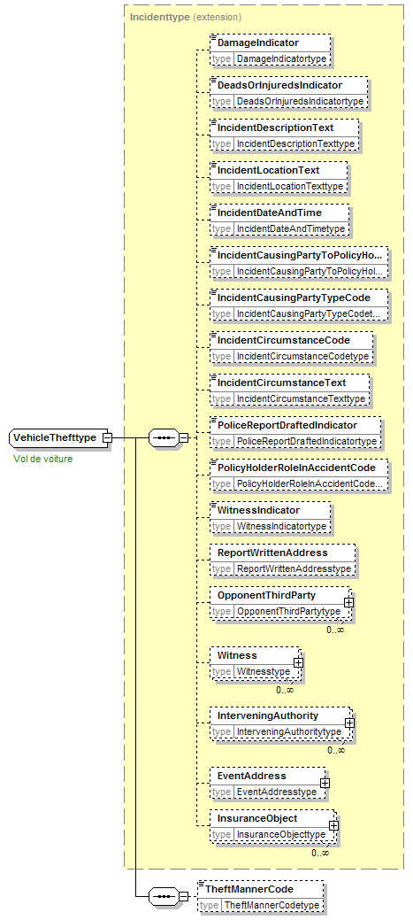 | source | <xsd:complexType name="VehicleThefttype"> <xsd:annotation> <xsd:appinfo source="tb2Semantics">The act of stealing a vehicle.</xsd:appinfo> <xsd:appinfo source="tb2Edifact">(EVT+568)</xsd:appinfo> <xsd:documentation source="BusinessTerm" xml:lang="fr">Vol de voiture</xsd:documentation> <xsd:documentation source="BusinessTerm" xml:lang="nl">Diefstal van voertuig</xsd:documentation> <xsd:documentation source="BusinessTerm" xml:lang="ge">Diebstahl von Fahrzeug</xsd:documentation> <xsd:documentation source="BusinessTerm" xml:lang="en">Theft of vehicle</xsd:documentation> <xsd:documentation source="BusinessDefinition" xml:lang="fr">Identifie un événement. Typiquement des événements dans un contexte sinistres</xsd:documentation> <xsd:documentation source="BusinessDefinition" xml:lang="nl">Identificeert een gebeurtenis. Men denkt hier in eerste instantie in het kader van de schades.</xsd:documentation> <xsd:documentation source="BusinessDefinition" xml:lang="en">The act of stealing a vehicle.</xsd:documentation> </xsd:annotation> <xsd:complexContent> <xsd:extension base="Incidenttype"> <xsd:sequence> <xsd:element name="TheftMannerCode" type="TheftMannerCodetype" minOccurs="0"/> </xsd:sequence> </xsd:extension> </xsd:complexContent> </xsd:complexType> |